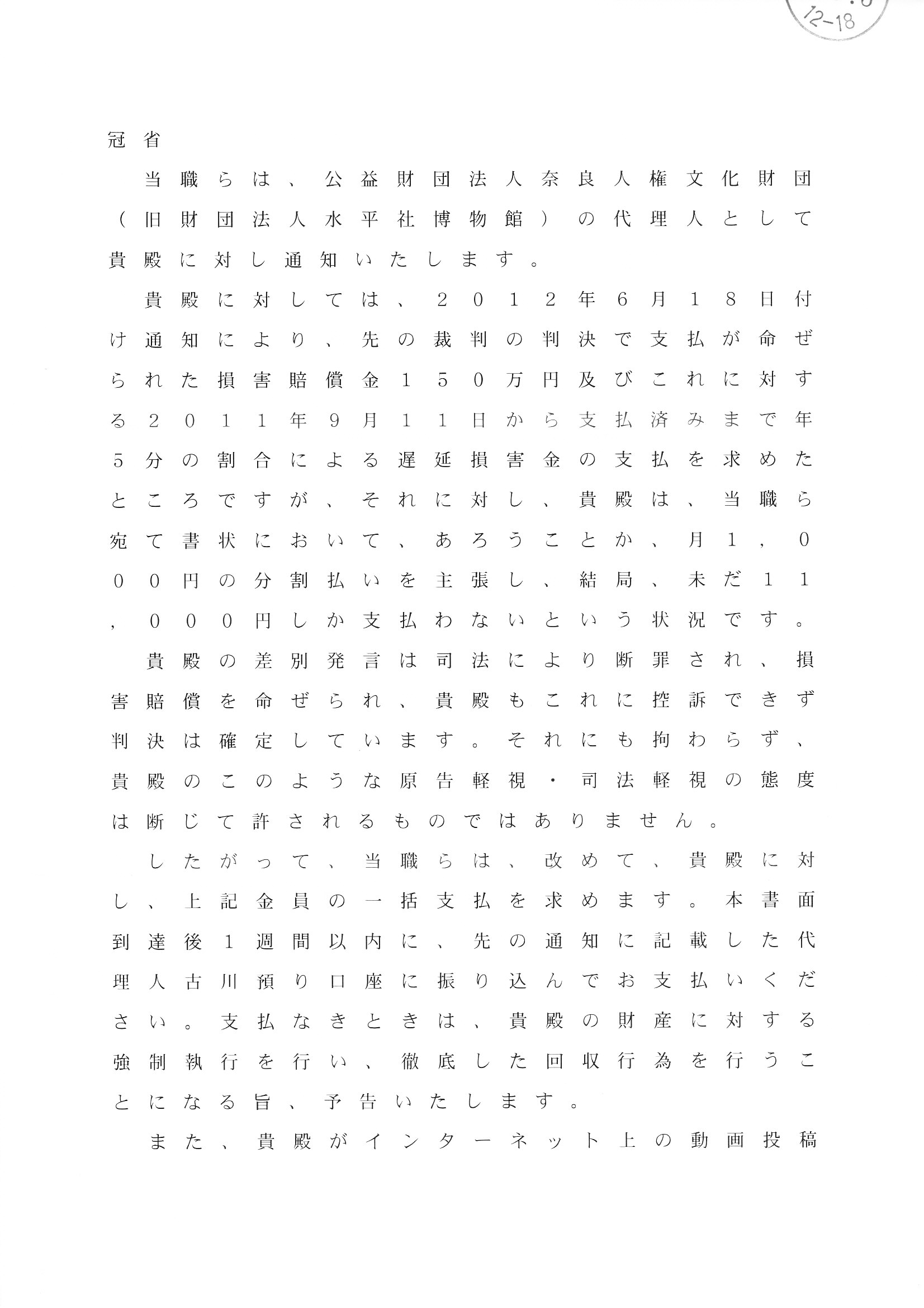 水平社博物館の弁護士から内容証明が来た