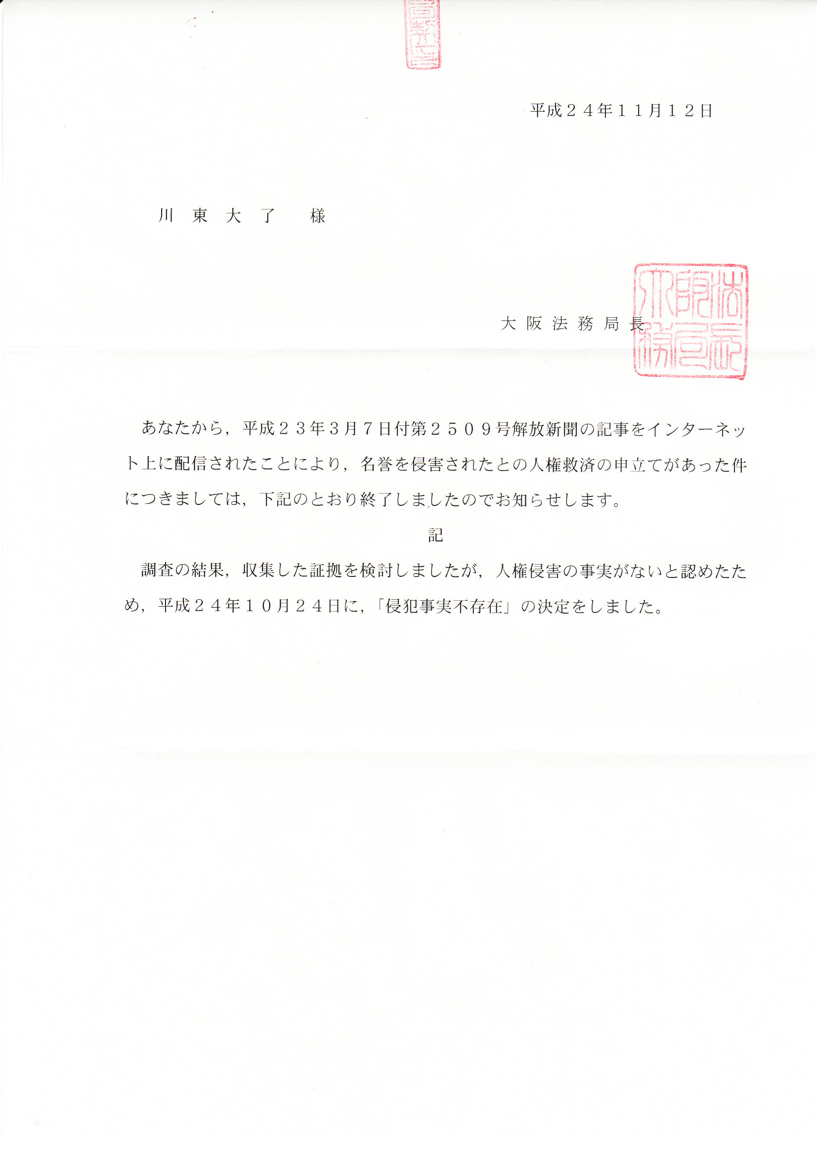 ・2度と同様の行為を行わないように勧告とあるが、「歴史捏造」を放置すれば、それによって差別が助長・惹起されてしまうので、「そんな事言うなら、俺が同様の事をしなくても良いように、お前たちから歴史捏造を訂正するように指導してくれ」とお願いしたい。仮に人権擁護局がそれをしてくれないなら、俺は差別のない社会の創造の為に、歴史捏造を糺さざるを得ない。