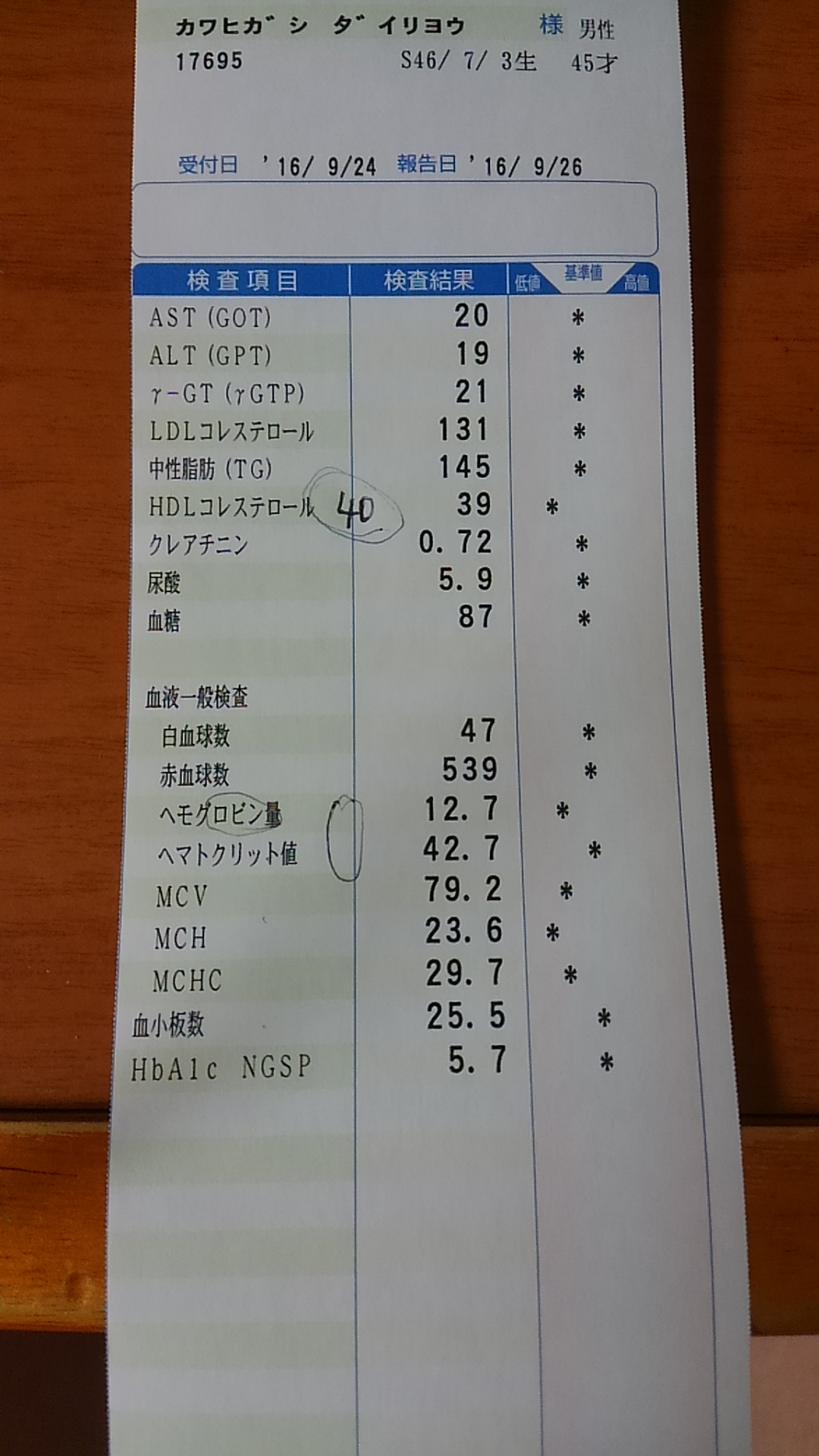 添付資料は9月24日に健康診断に行った際の血液検査表です。