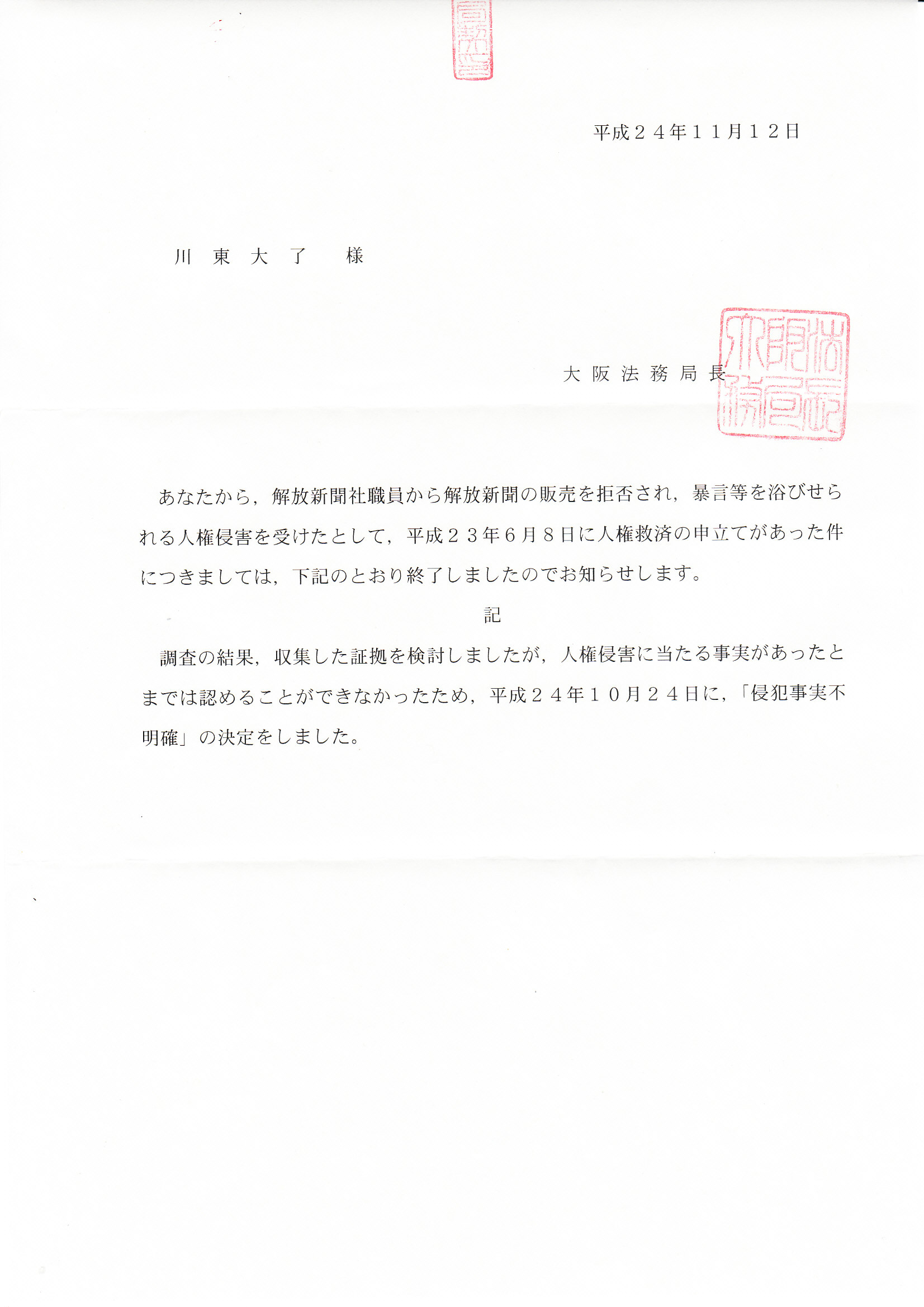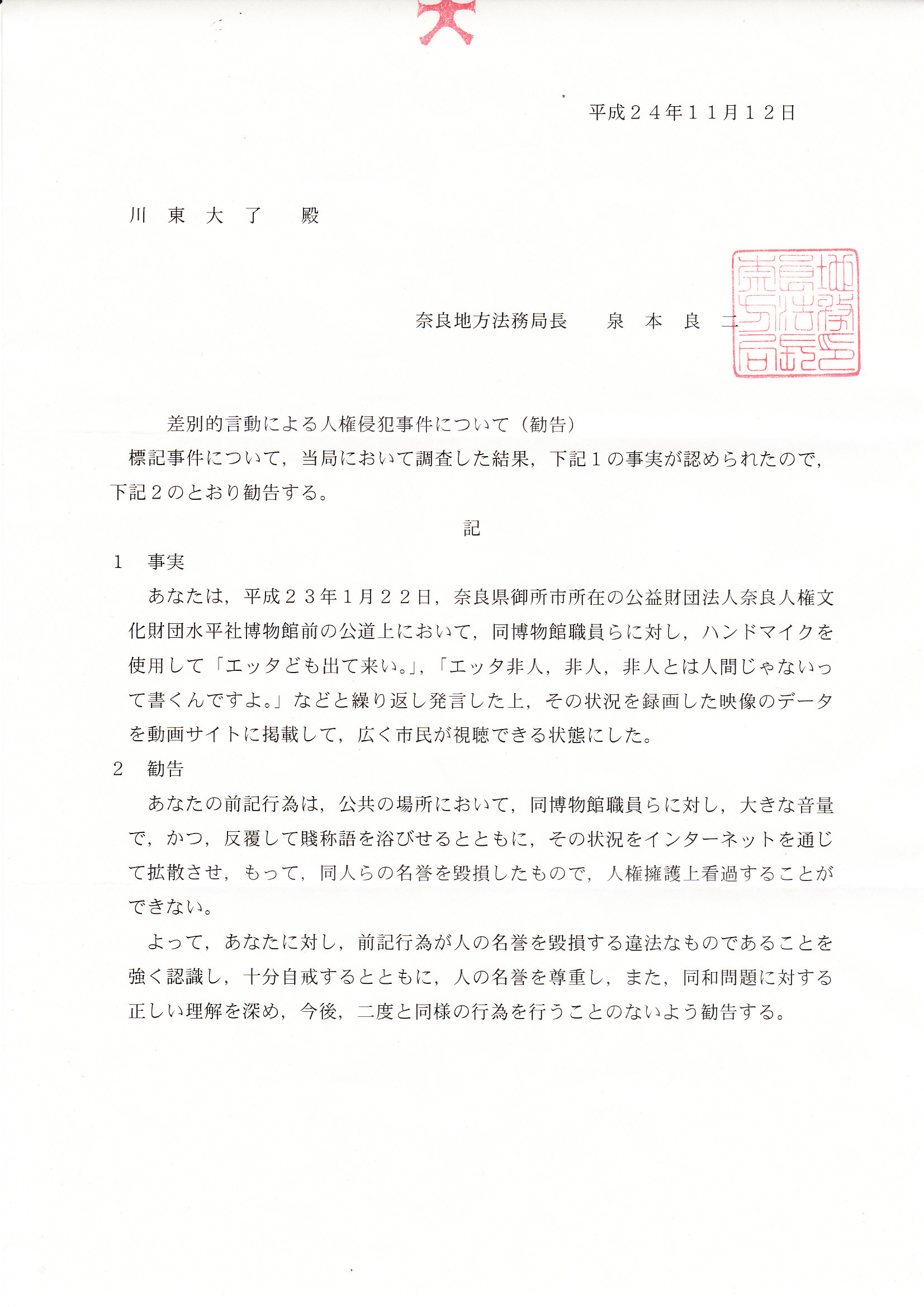 ・2度と同様の行為を行わないように勧告とあるが、「歴史捏造」を放置すれば、それによって差別が助長・惹起されてしまうので、「そんな事言うなら、俺が同様の事をしなくても良いように、お前たちから歴史捏造を訂正するように指導してくれ」とお願いしたい。仮に人権擁護局がそれをしてくれないなら、俺は差別のない社会の創造の為に、歴史捏造を糺さざるを得ない。
