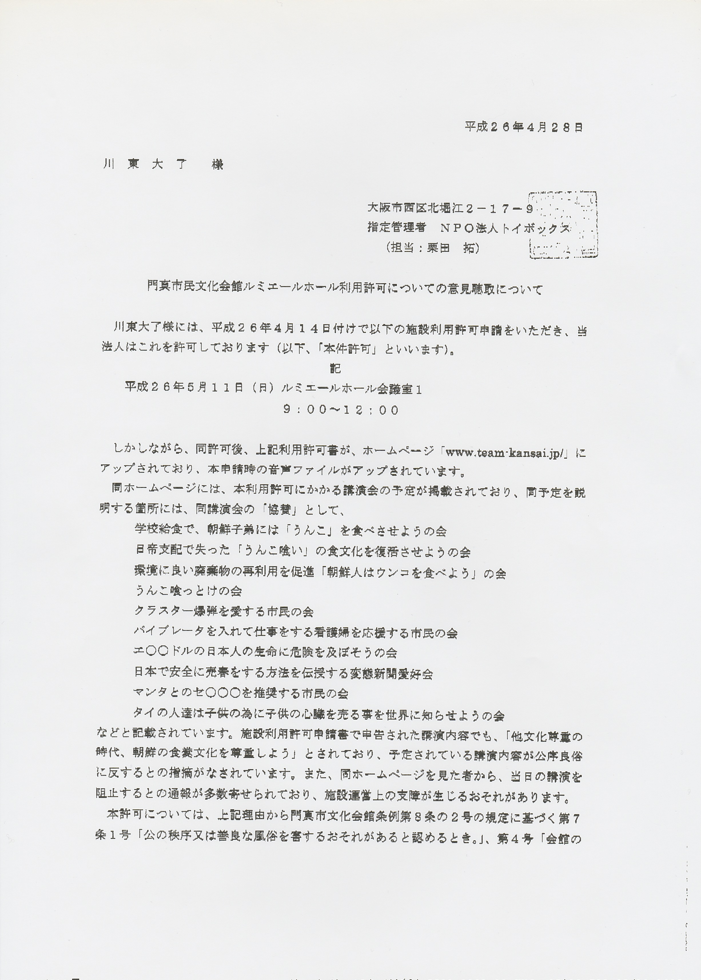 それとも、「当日の講演を阻止するとの通報が多数寄せられており、施設運営上の支障が生じるおそれがあります」について私の反論を求めているのか?